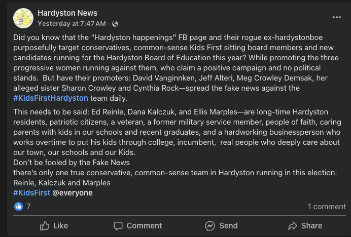 A recent anonymous Kids First Hardyston post claims I - and other residents - are spreading “fake news” to hurt their campaign.