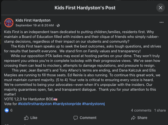 Hardyston needs leaders who match their actions to their words. The evidence shows Kids First doesn’t.